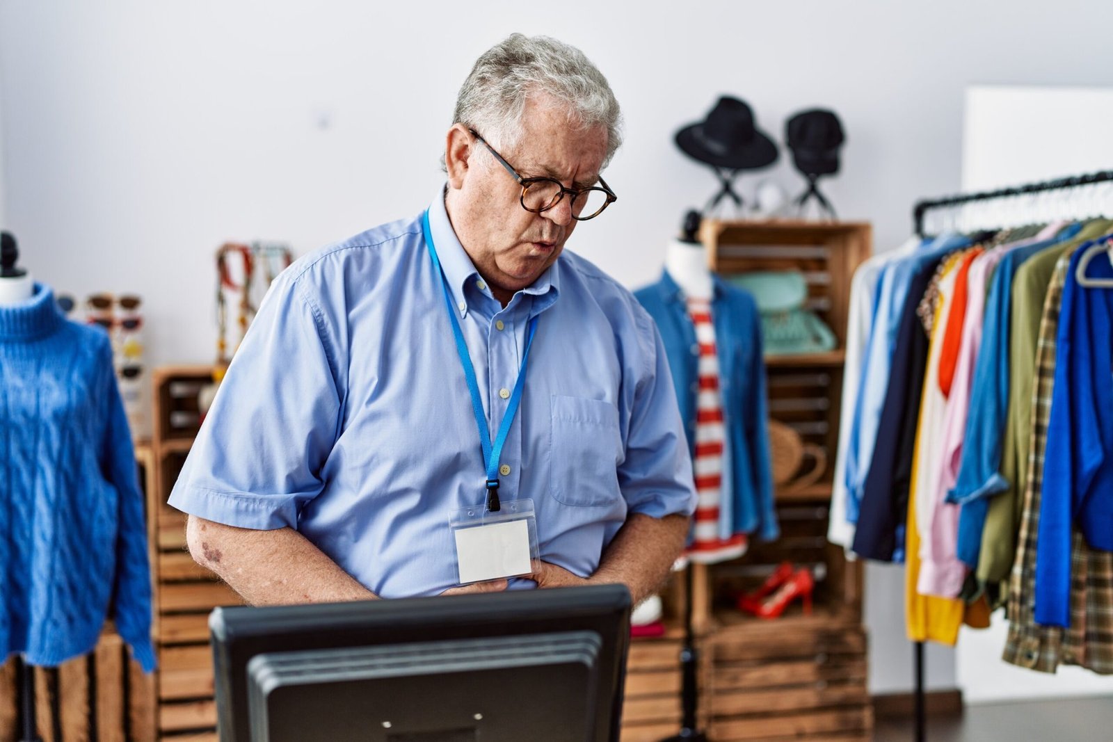 Senior worker in retail at cash register saying "uh oh" or noticing a mistake