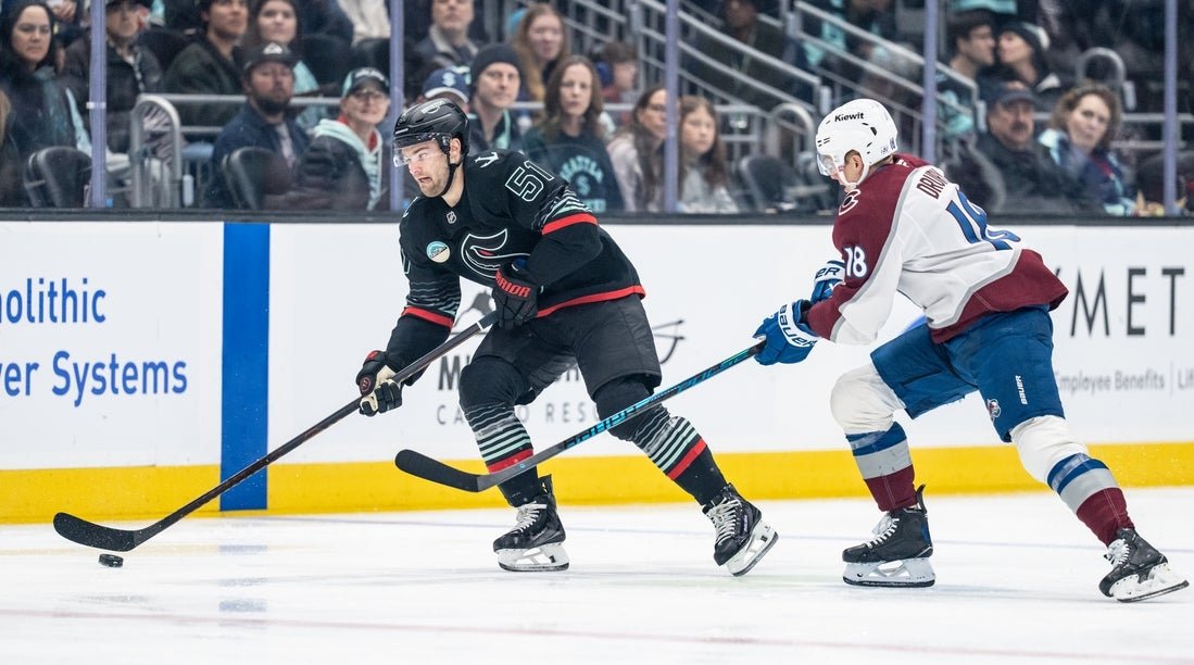 Mar 12, 2026; Seattle, Washington, USA; Seattle Kraken forward Shane Wright (51) skates against Colorado Avalancheforward Jack Drury (18) during the first period at Climate Pledge Arena. Mandatory Credit: Stephen Brashear-Imagn Images Despite a 2-6-0 record since the Olympic break, the Seattle Kraken somehow held on to the Western Conference’s second and final wild-card playoff spot.