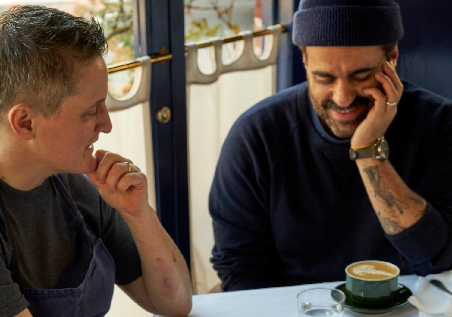 April Bloomfield and Gabriel Stulman sitting at a table at Sailor in Fort Greene, Brooklyn